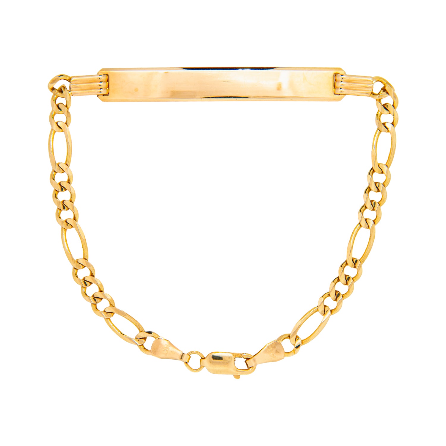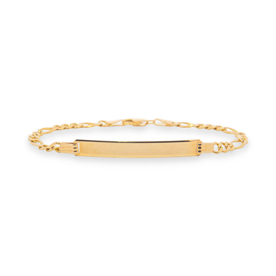 This 14K yellow gold estate ID bracelet features a classic Figaro chain paired with a smooth center plate, ideal for personalization. It’s finished with a secure lobster claw clasp, offering a timeless and elegant look.Details