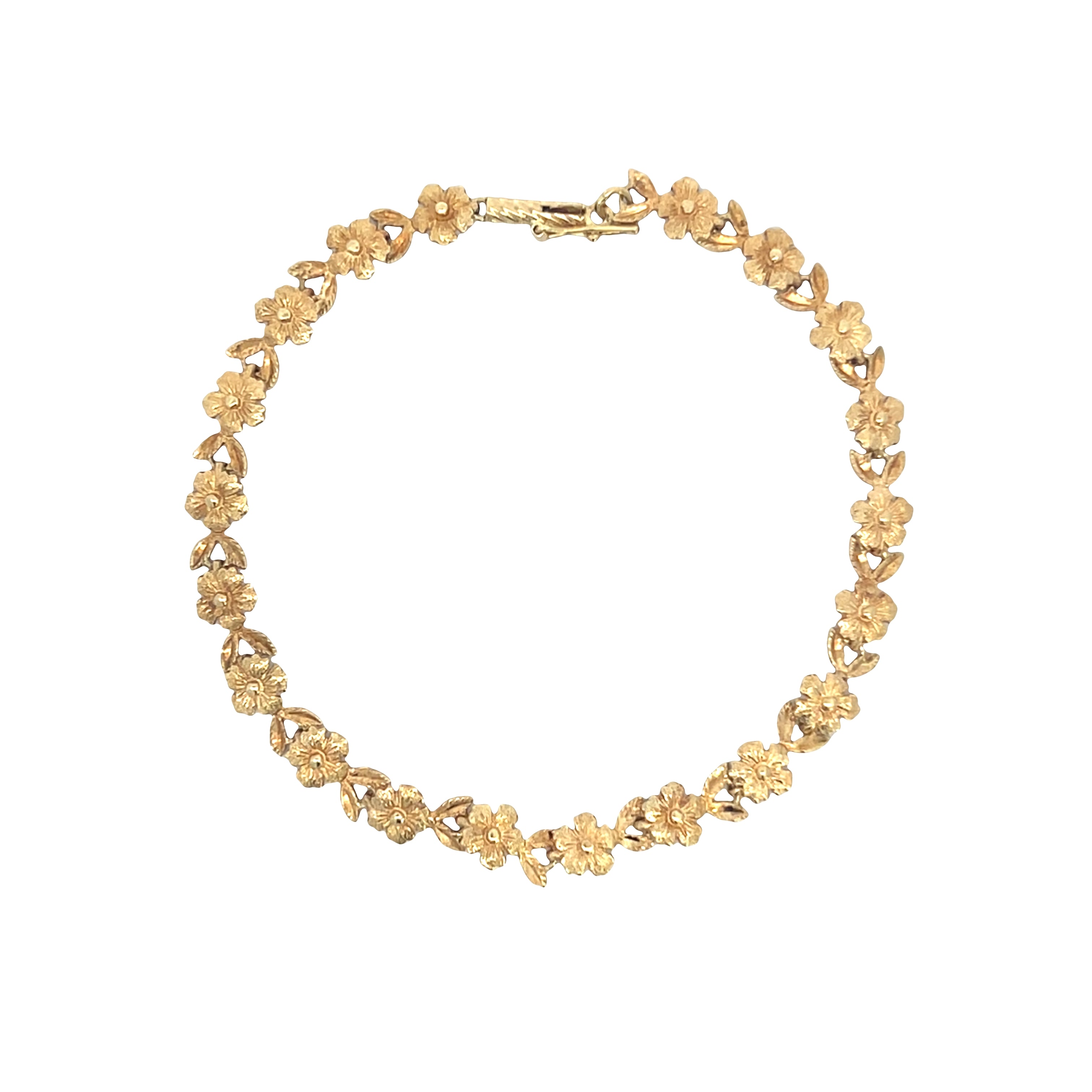 This estate 14K yellow gold bracelet showcases delicate floral motifs with intricately detailed petals and centers linked together in a charming garden-inspired design. The secure barrel clasp is enhanced with a figure eight safety mechanism for reliable and worry-free wear. This bracelet is a romantic heirloom that brings the eternal beauty of nature's blooms to life on the wrist.Details
