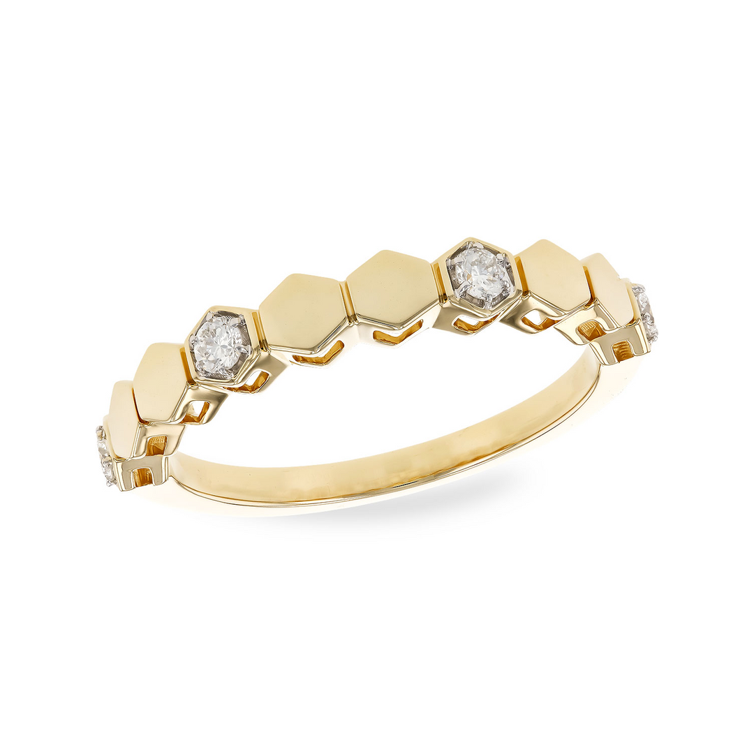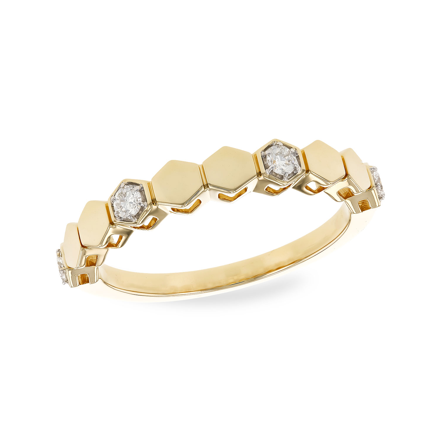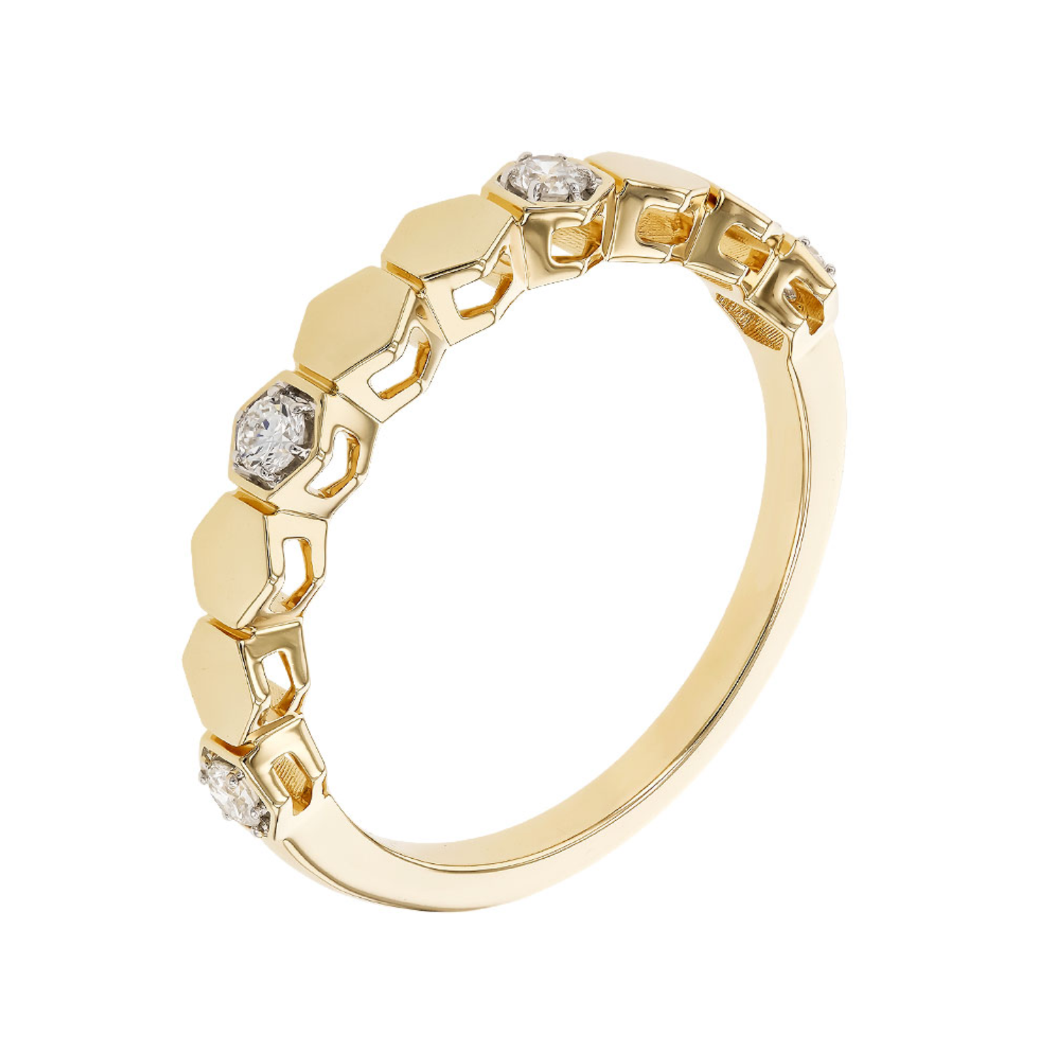 14 karat yellow gold geometric ring set with four round brilliant cut diamonds at 0.15 carat total weight with G color and SI2 clarity.Details
