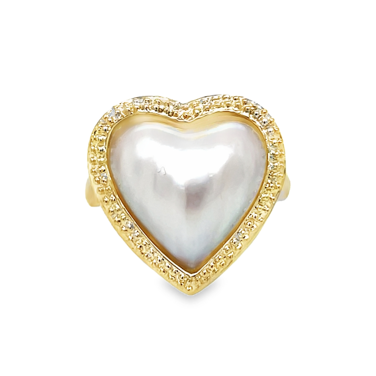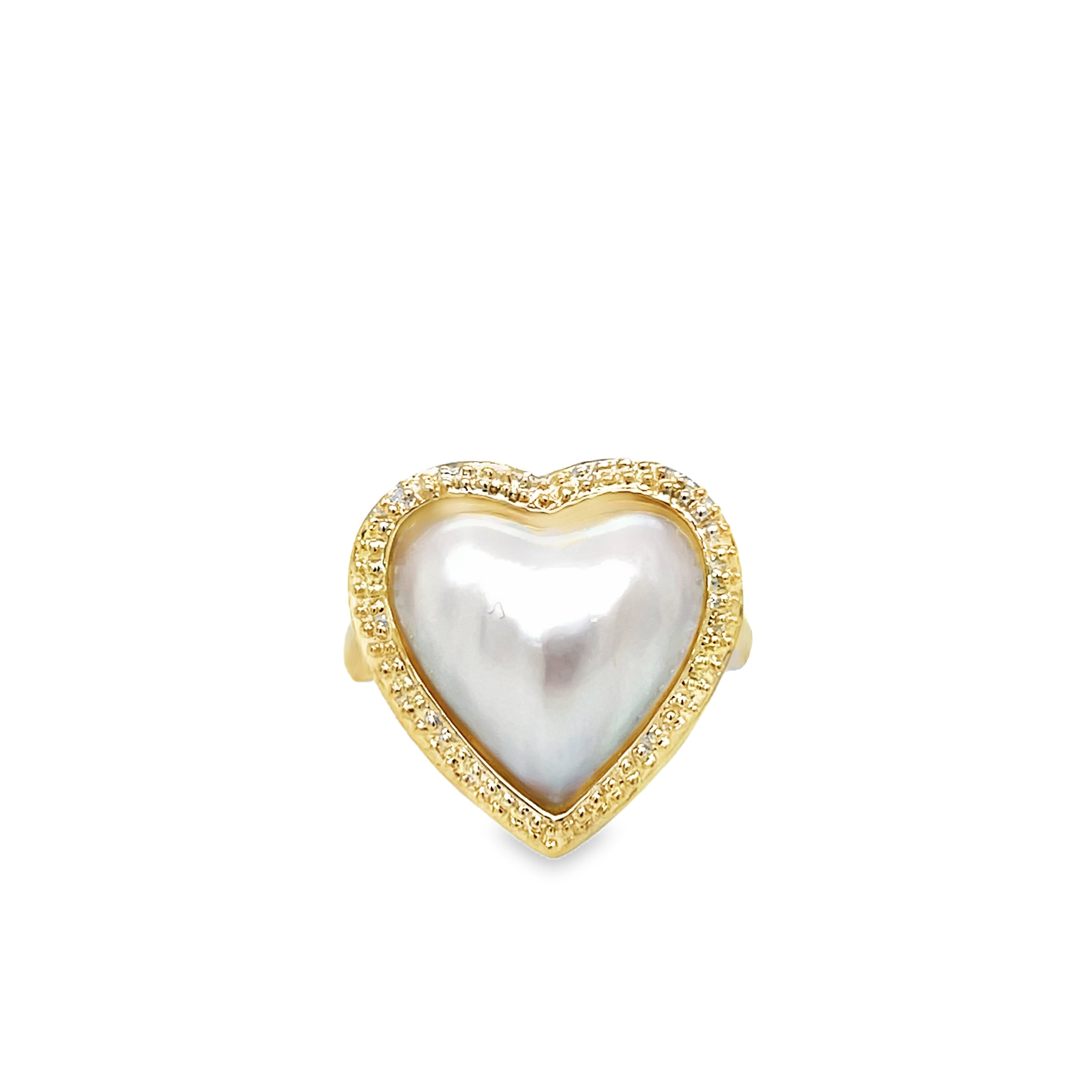 This elegant estate ring features a stunning heart-shaped cultured freshwater Mabé pearl, embraced by a gleaming 14K yellow gold setting. Perfect for those who adore unique, timeless pieces, this ring captures the beauty and allure of vintage jewelry with a modern twist. A symbol of love and elegance, this estate piece is both sophisticated and charming.Details