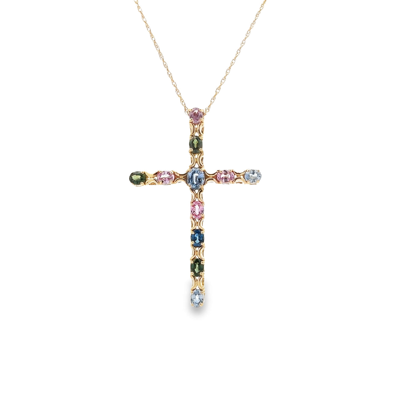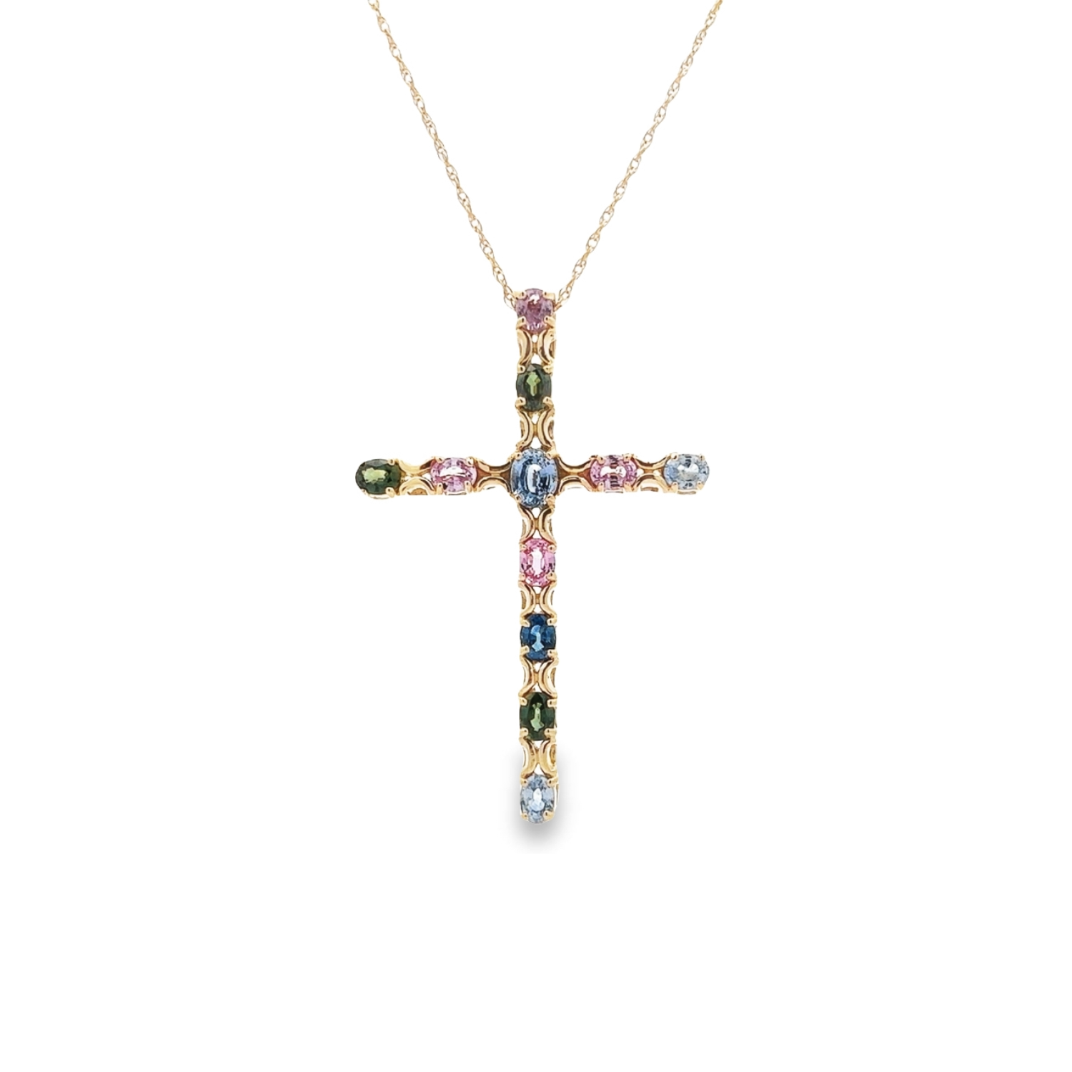 Embrace a spectrum of divine inspiration with this estate 14K yellow gold muticolor sapphire cross pendant. This exquisite piece is a vibrant celebration of faith and craftsmanship, featuring an array of multicolored sapphires. The gemstones, each carefully selected for their color and clarity, are arrayed in a prismatic sequence that adorns the arms of the cross, showcasing shades from deep blues to lush greens, passionate pinks, and serene blues. The intricate gold setting, with its subtle engravings and polished finish, complements the colorful sapphires, creating a pendant that is both a spiritual symbol and a fashion statement. Suspended from a delicate gold chain, it's a piece designed to be cherished and displayed as a testament to personal belief and impeccable style.Details