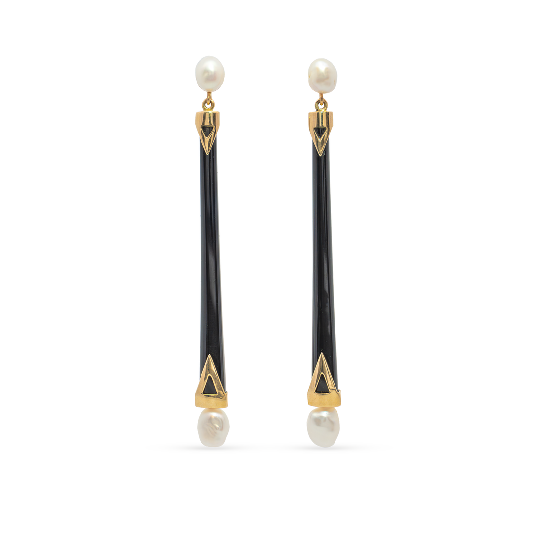 These estate earrings are crafted in 14K yellow gold and feature sleek onyx bars accented by four freshwater cultured pearls. Their elongated design and striking contrast of black and white create a bold, elegant look that blends vintage charm with modern sophistication.