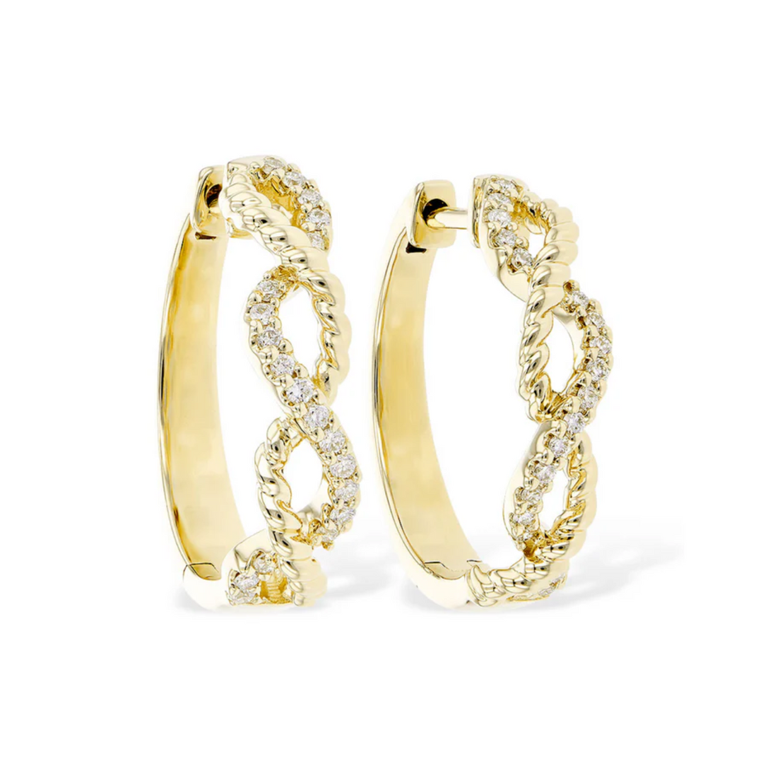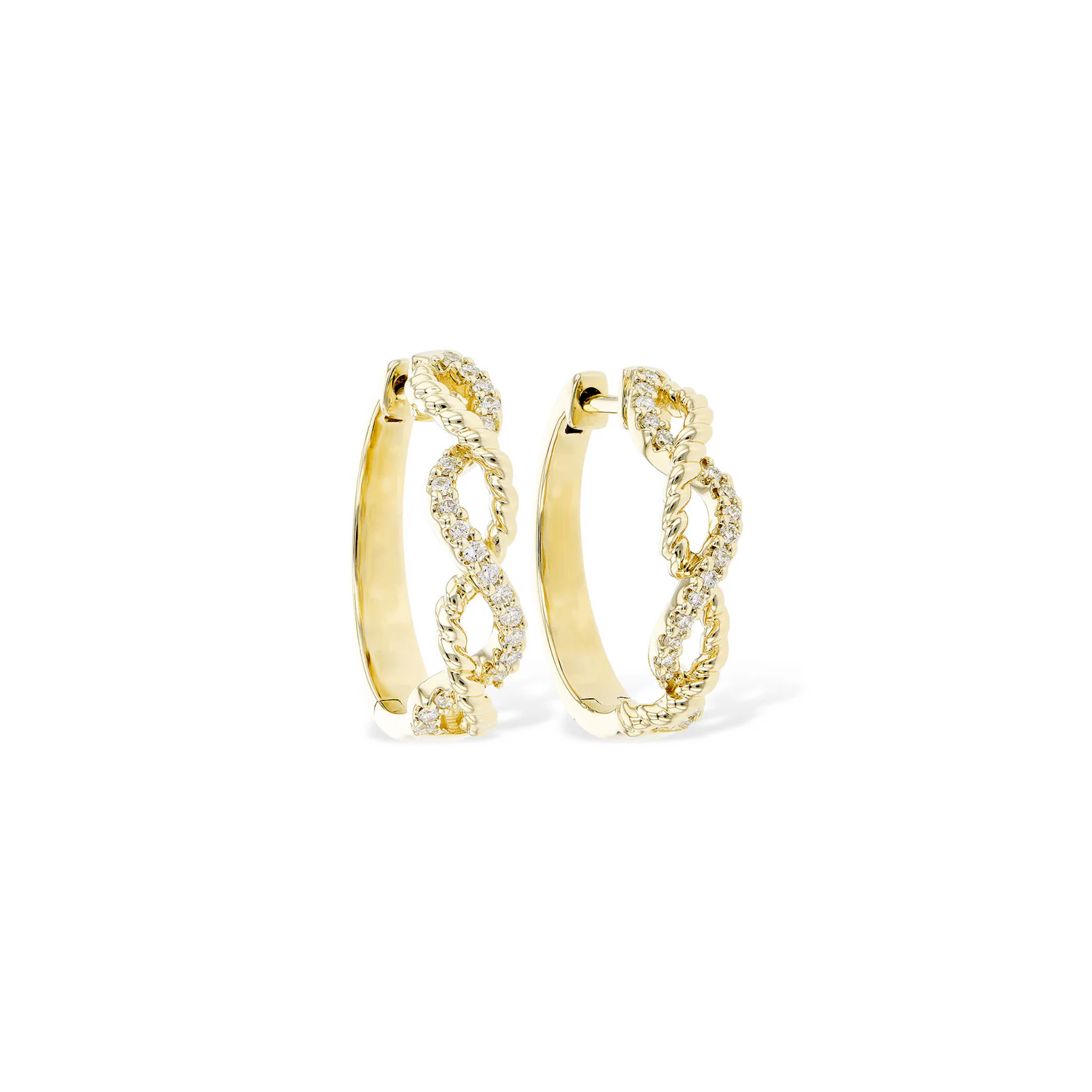 These 14K yellow gold hoop earrings feature an intricate twisted design that adds dimension and charm. Each twist is adorned with round brilliant cut diamonds, bringing a subtle shimmer to the delicate gold structure. They offer a graceful and refined look for any occasion.Details