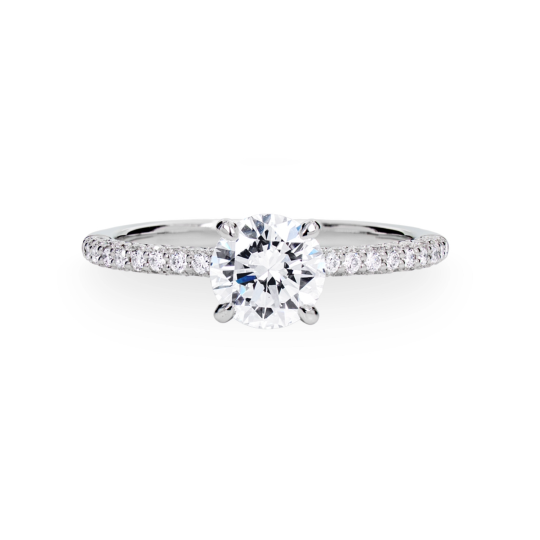 Crafted in 18K white gold, this wedding set includes an engagement ring with a round brilliant cut center diamond accented by pavé set diamonds. A matching pavé diamond wedding band completes the set, offering a cohesive and elegant design that sparkles from every angle.Details