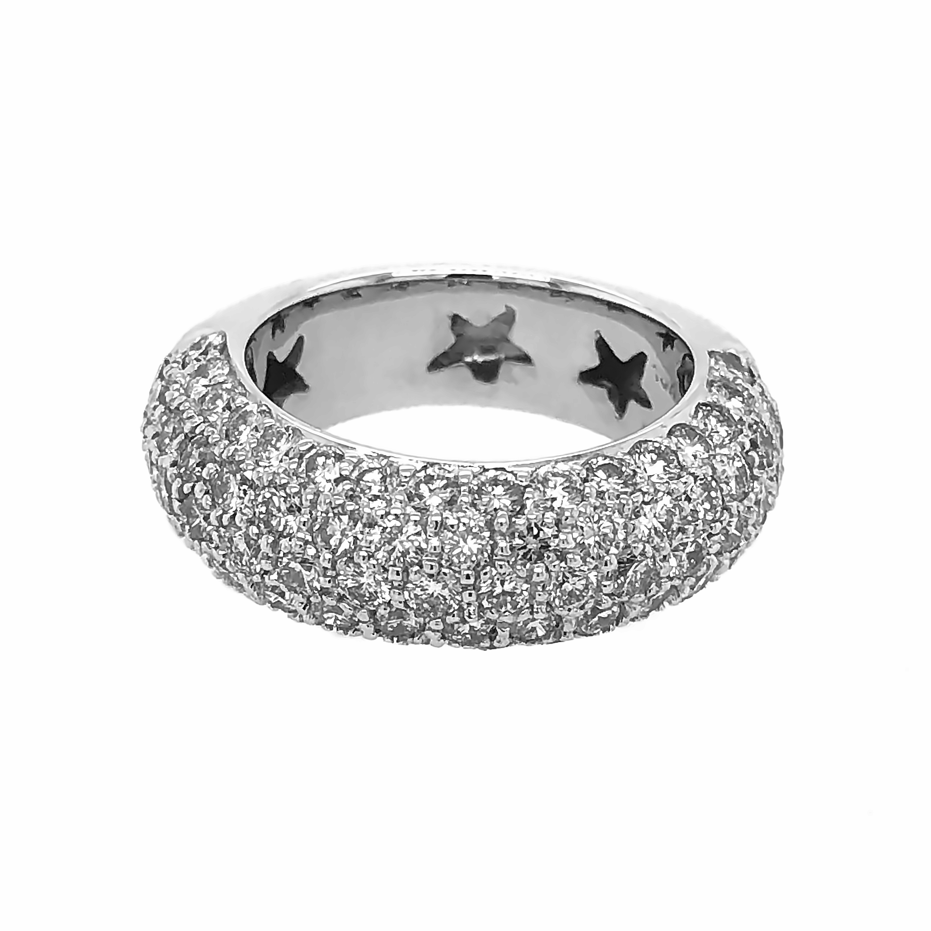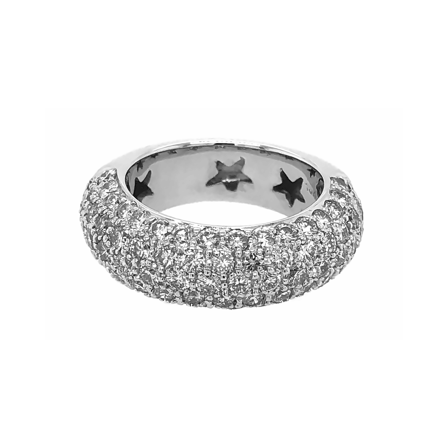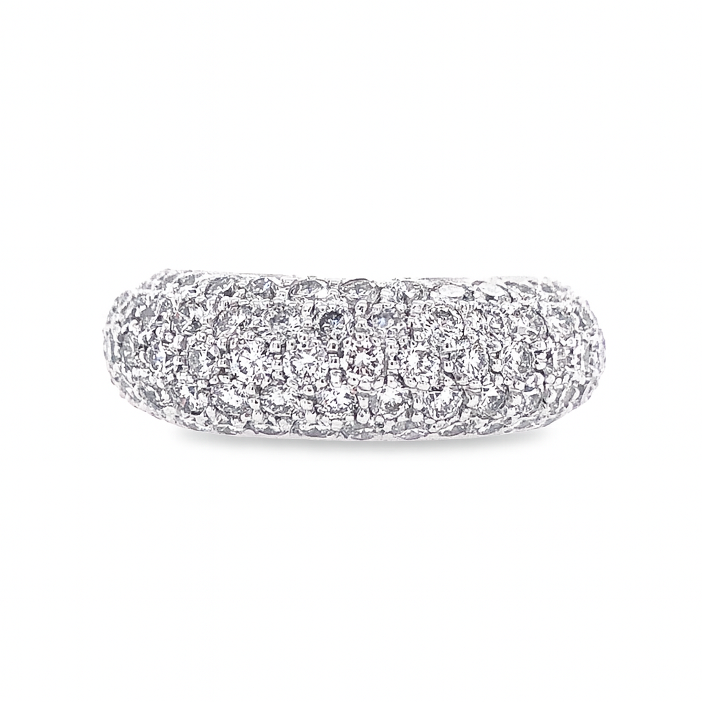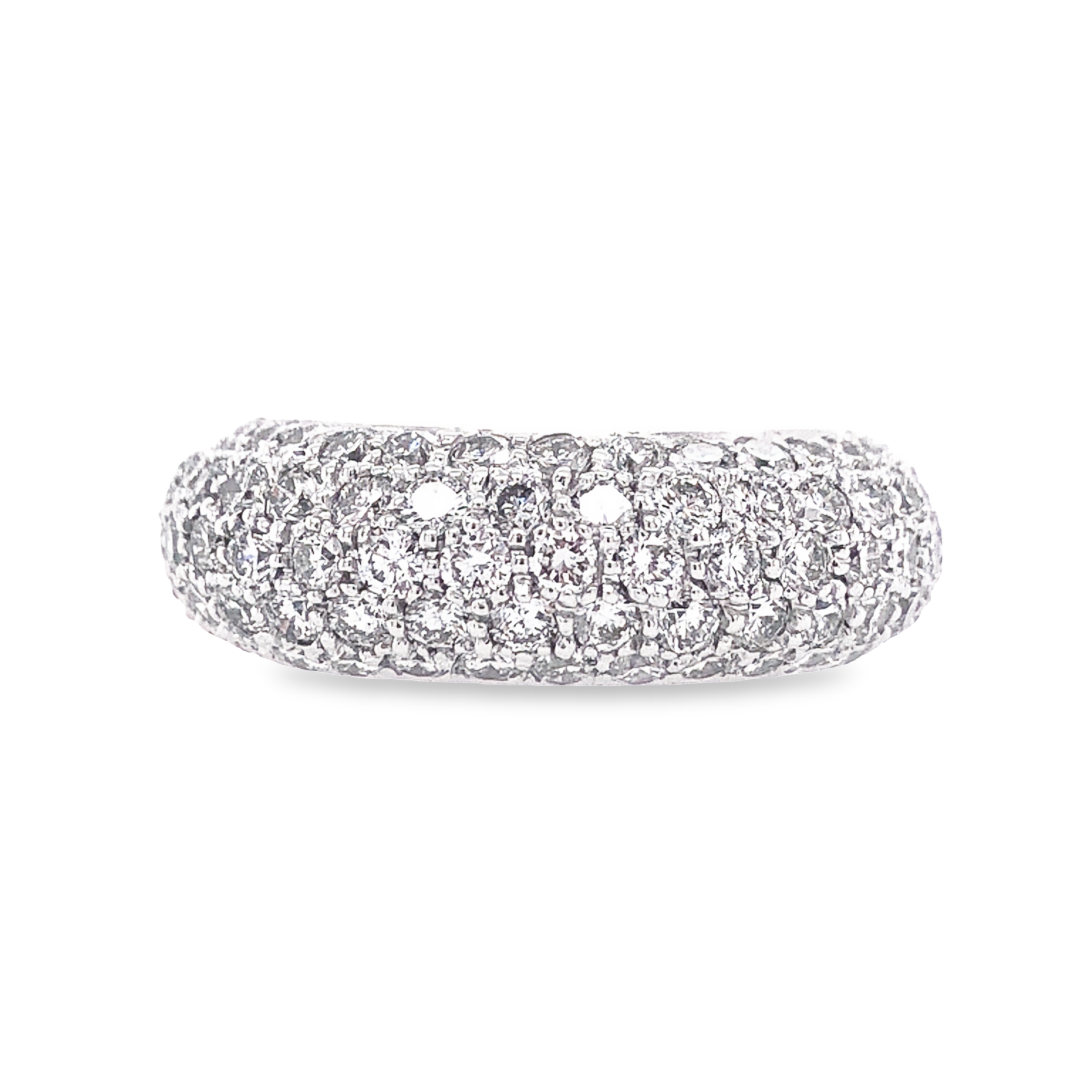 Experience timeless elegance with this 18K white gold pavé diamond estate band. Featuring radiant rows of closely set diamonds, this band captures and reflects light brilliantly. The lustrous 18K white gold setting offers a stunning contrast to the sparkle of the diamonds, making it a versatile and captivating piece. Whether worn solo or paired with other favorites, it adds a touch of sophistication to any ensemble.Details