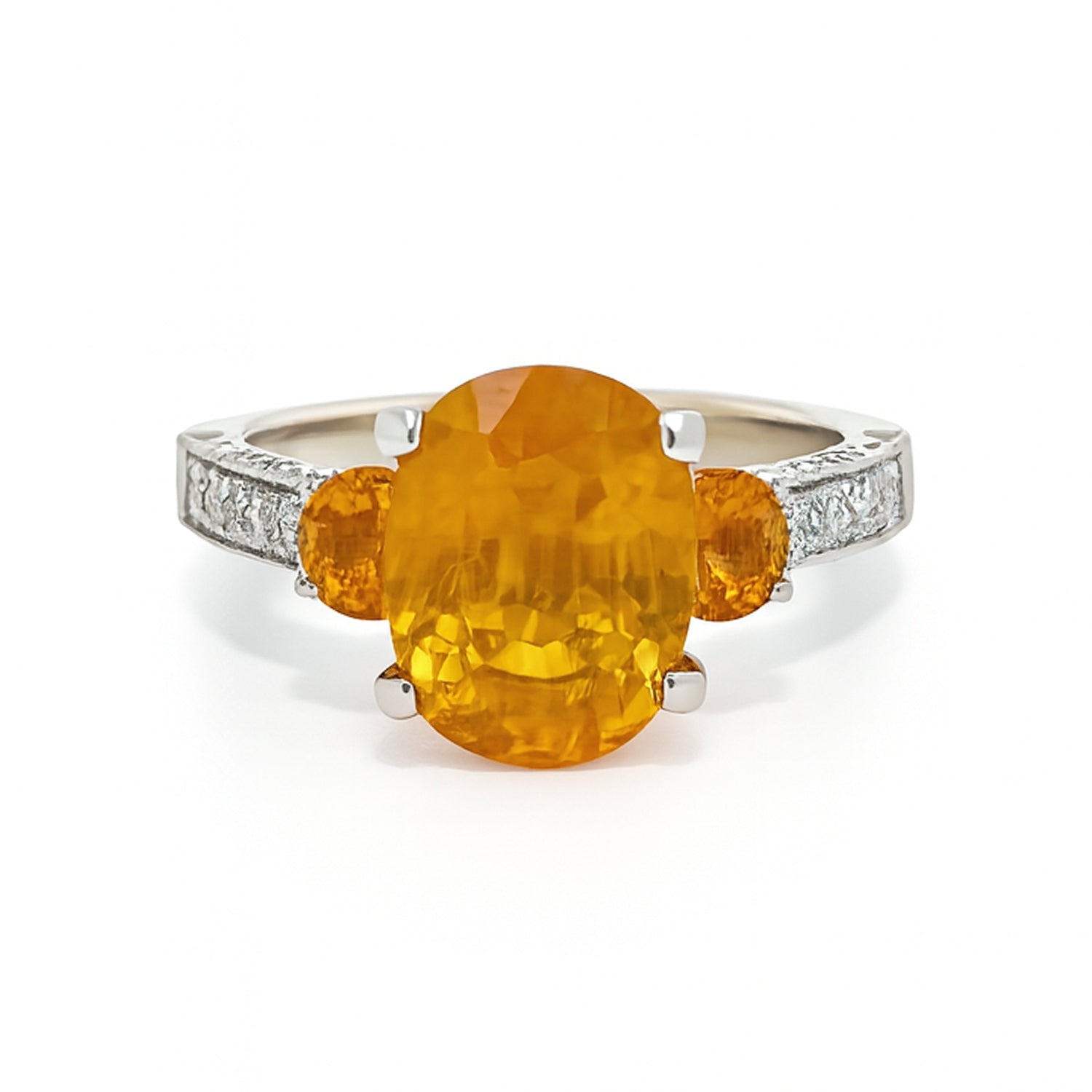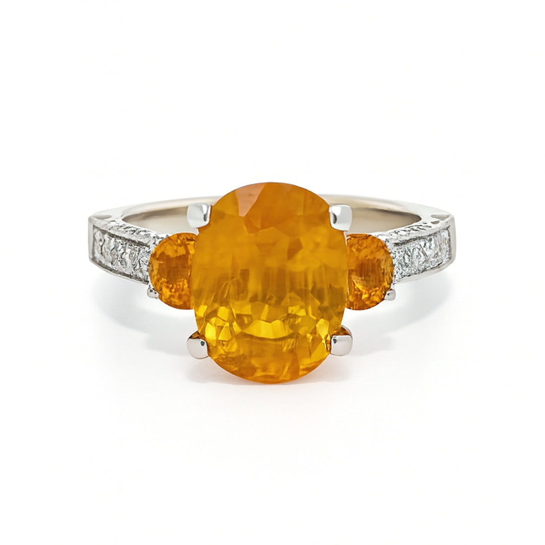 18 karat white gold estate three stone style fashion ring set with one approximately 3.25 carat oval beryllium diffused yellow sapphire, accented by two round beryllium diffused yellow sapphires at 0.66 carat total weight, and 22 round brilliant cut diamonds at 0.25 carat total weight with H - I - J color and SI1 - I1 clarity.Details