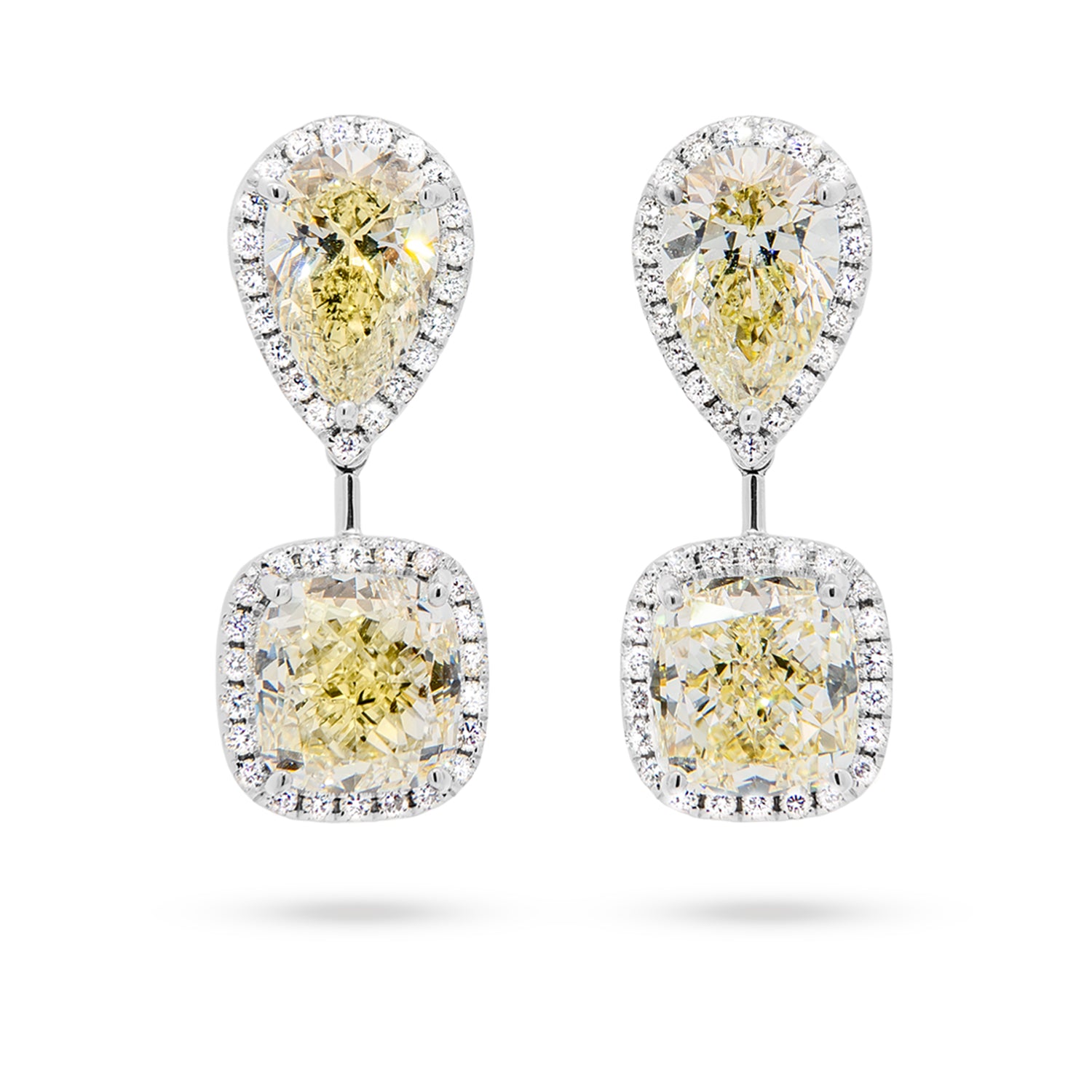 18 karat white gold two stone halo dangle earrings set with one 2.01 carat cushion cut diamond with S to T color and VS1 clarity (GIA Report #: 5231327564), one 2.01 carat cushion cut diamond with W to X color and VS1 clarity (GIA Report #: 2235327569), accented with two pear shaped diamonds at 2.10 carat total weight with P - Q - R color and SI1 - SI2 clarity, and 86 round brilliant cut diamonds at 0.43 carat total weight with L - M - N color and VS1 - SI1 clarity, equipped with friction style backs.Details