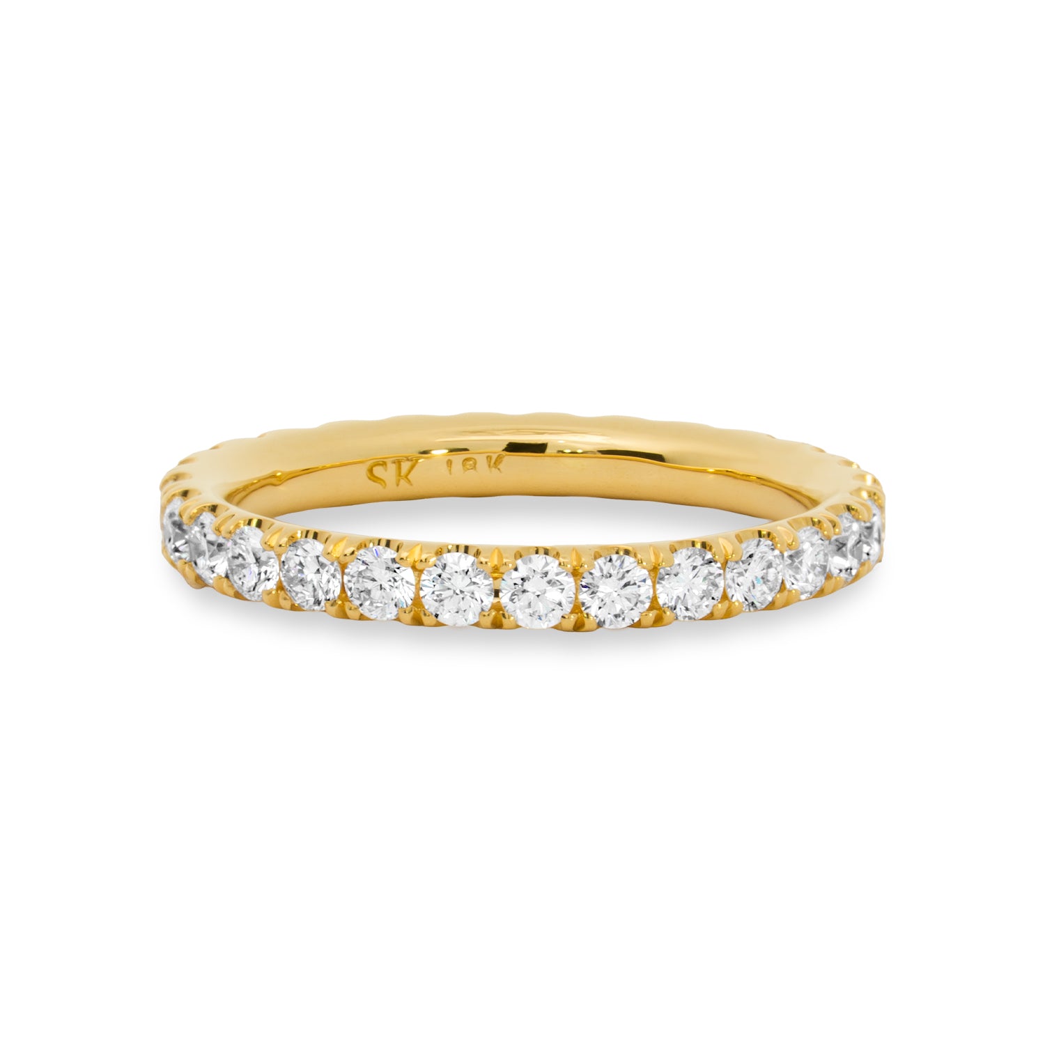 This 18K yellow gold estate band is set with a continuous row of round brilliant cut diamonds, creating an elegant eternity design. With its timeless sparkle and enduring style, it’s perfect as a wedding band, anniversary band, or statement piece.Details