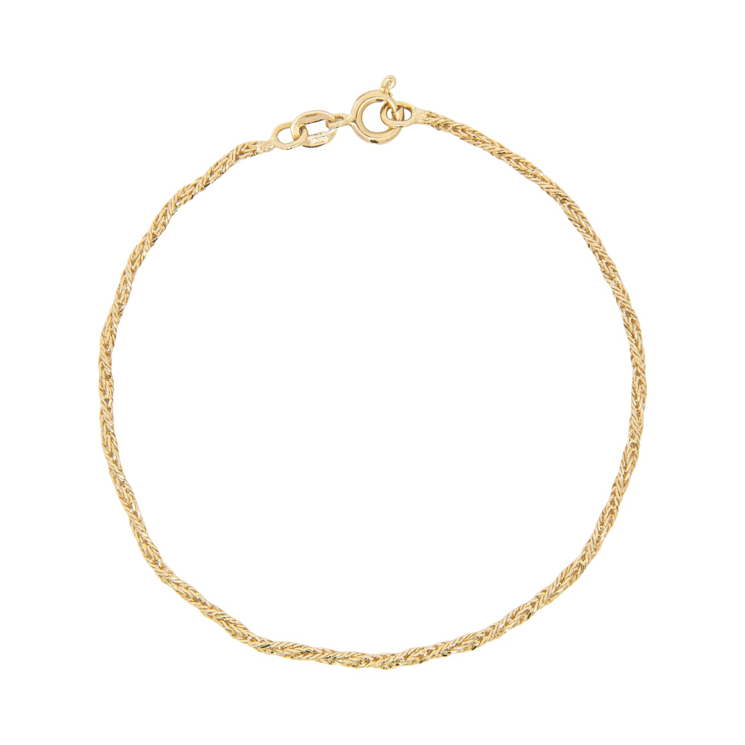 This 18K yellow gold estate bracelet features a twisted diamond-cut wheat chain that catches the light beautifully. Finished with a secure spring ring clasp, it offers a refined and classic look.Details