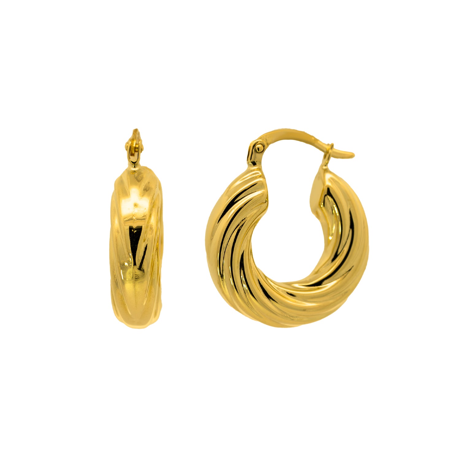 These 18K yellow gold hoop earrings feature an elegant twisted design that adds depth and dimension to a classic silhouette. The high-polish finish enhances their radiant glow, making them a versatile accessory for any occasion.Details
