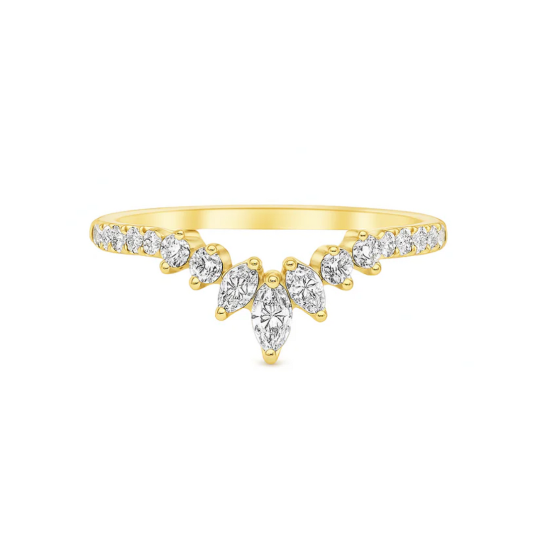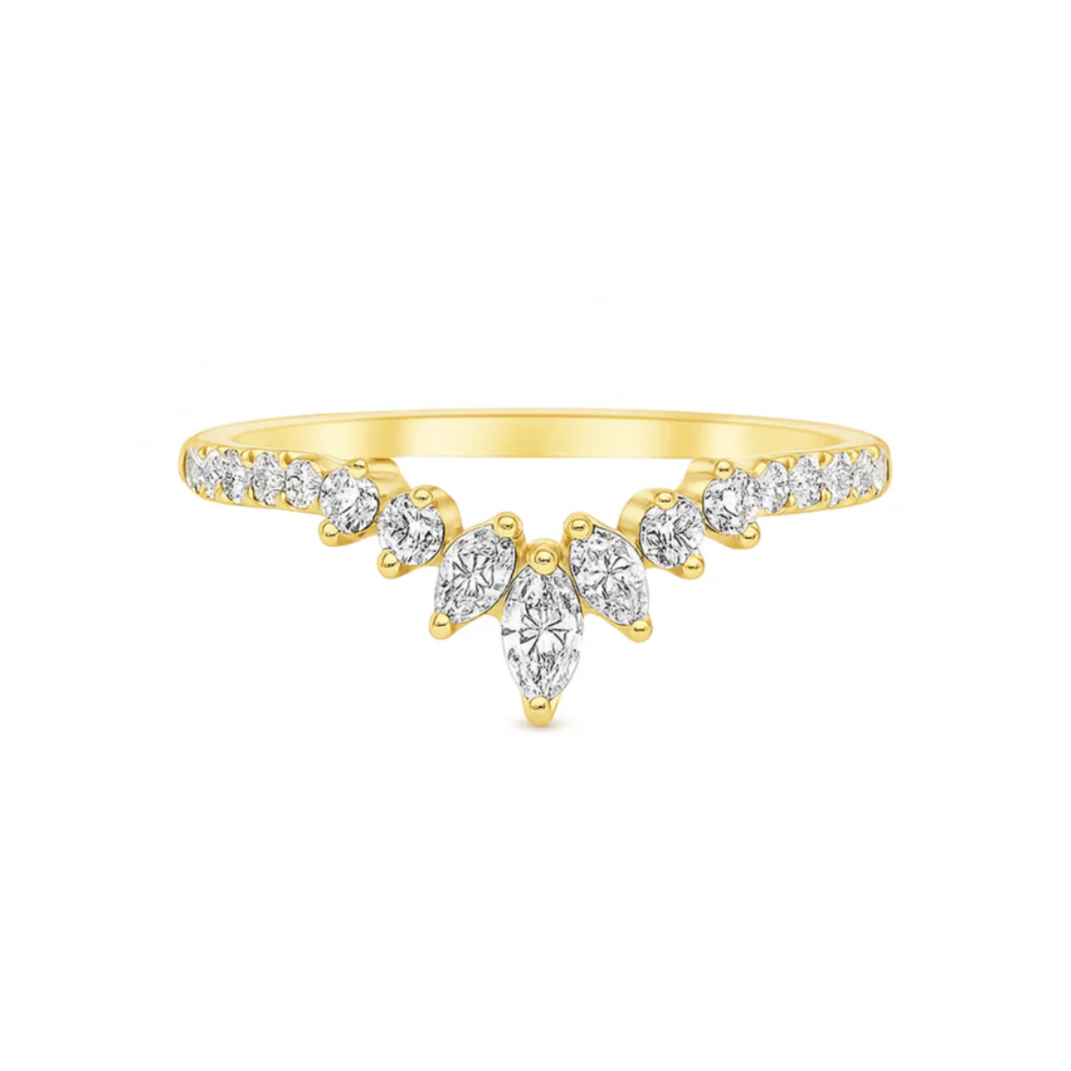 This 18K yellow gold Bensel Made contour wedding band features a stunning arrangement of marquise cut and round brilliant cut diamonds. Designed to elegantly complement your engagement ring, its graceful curve and sparkling diamonds create a seamless, radiant look. A timeless piece with a sophisticated touch.Details