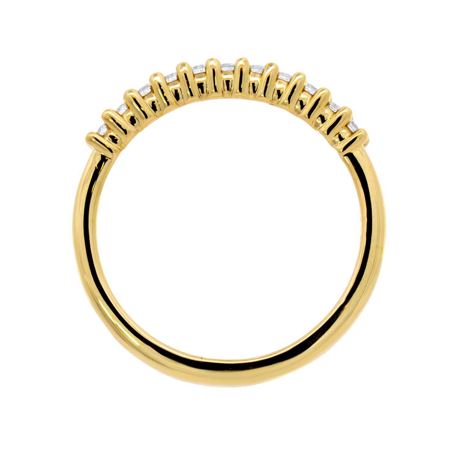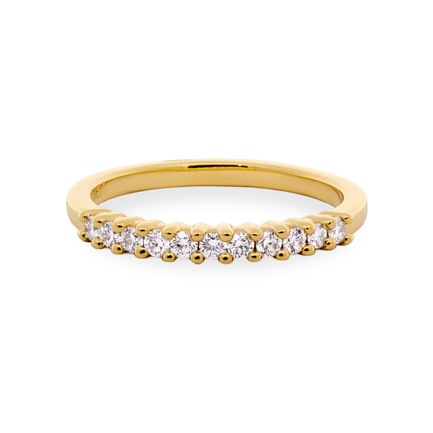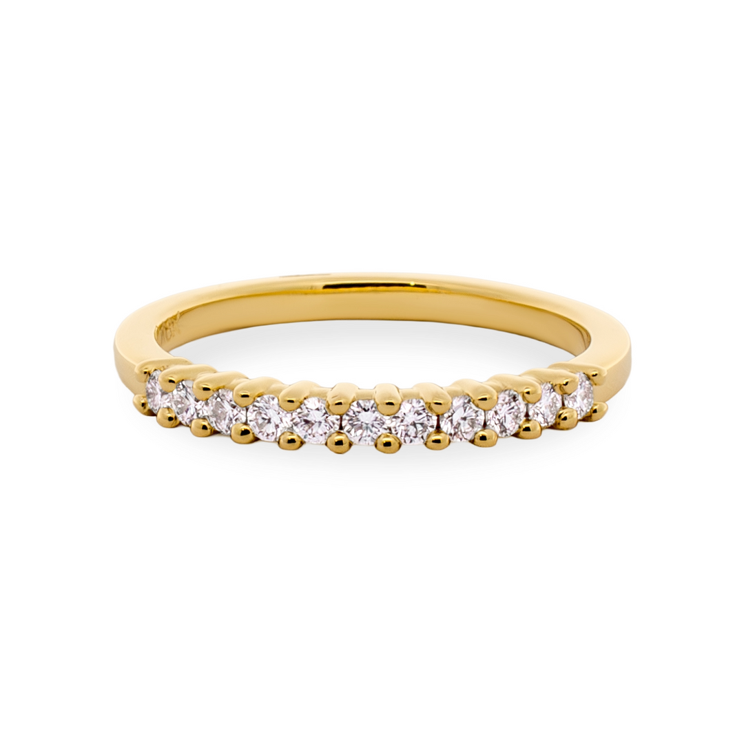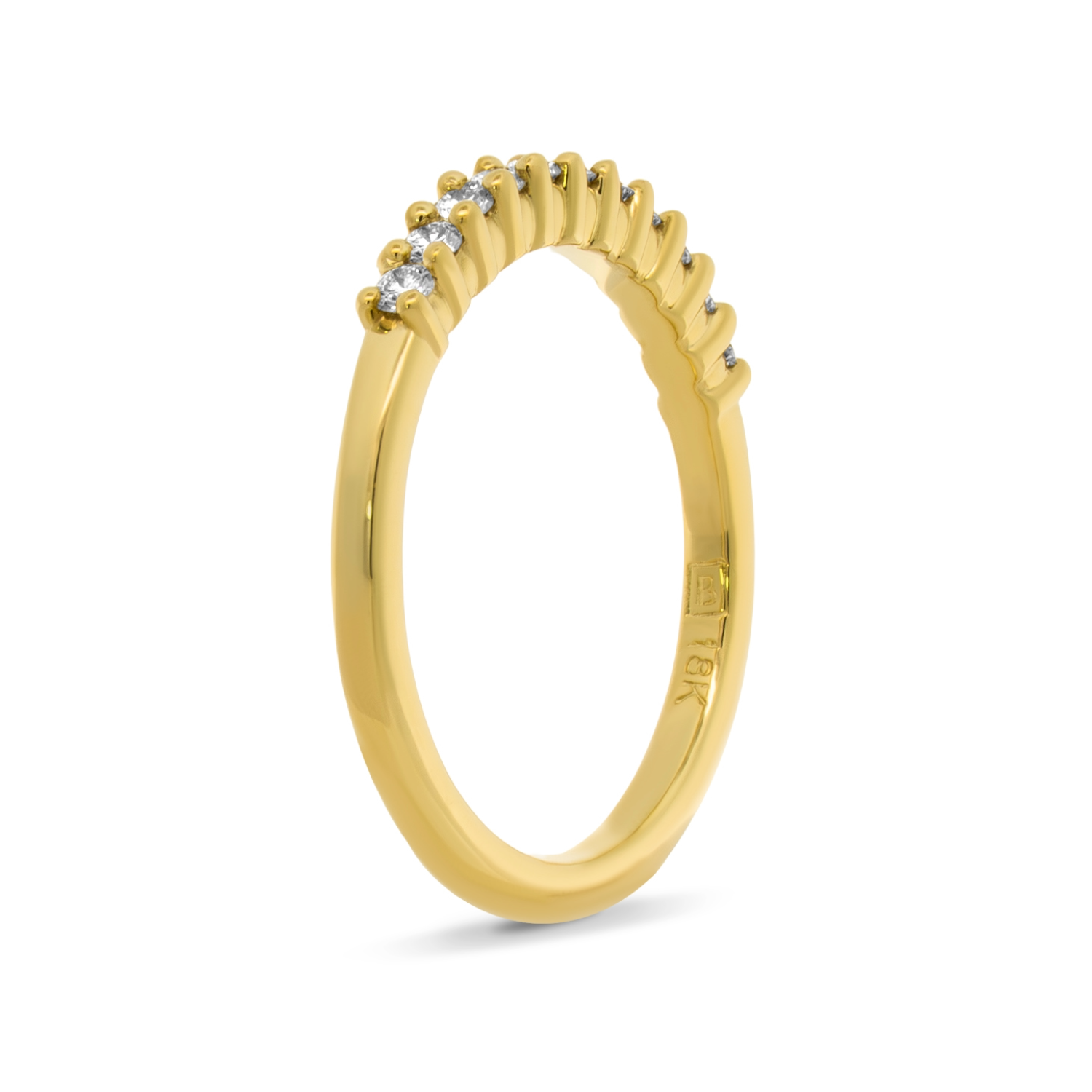 This Bensel Made band features round brilliant cut diamonds set in a shared prong design across the top of a rich 18K yellow gold ring. Crafted with exceptional quality and attention to detail, it pairs beautifully with Bensel Made engagement rings or adds refined brilliance when worn alone.Details