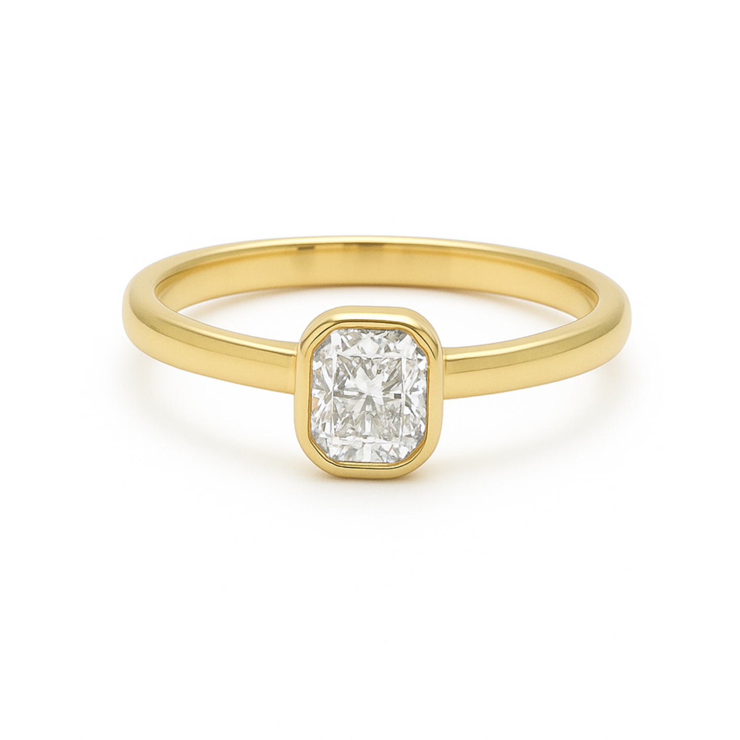 This 18K yellow gold ring from our Bensel Made collection features a bezel set radiant cut diamond. With clean lines and a modern silhouette, this solitaire design balances refined simplicity with striking brilliance.Details
