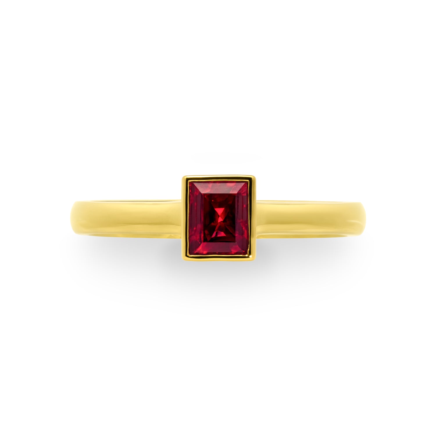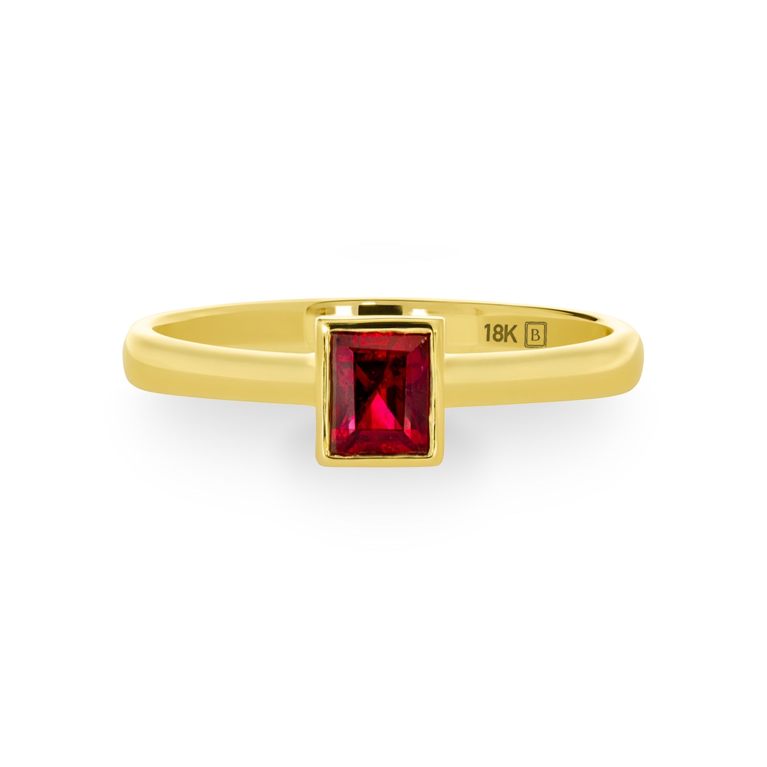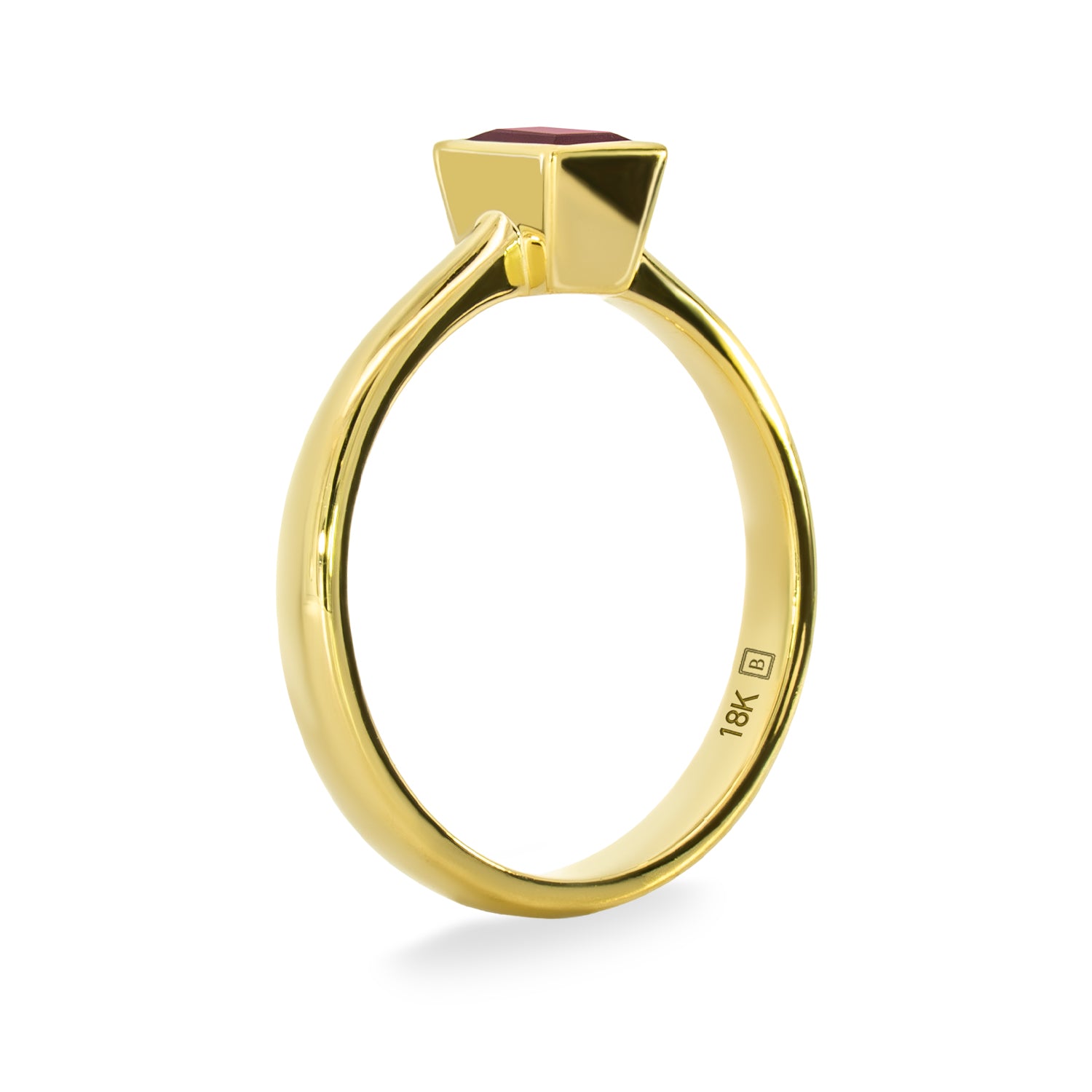 This 18K yellow gold ring from our Bensel Made collection features a bezel set princess cut ruby at the center. The clean lines and rich color create a striking solitaire design with modern character.Details