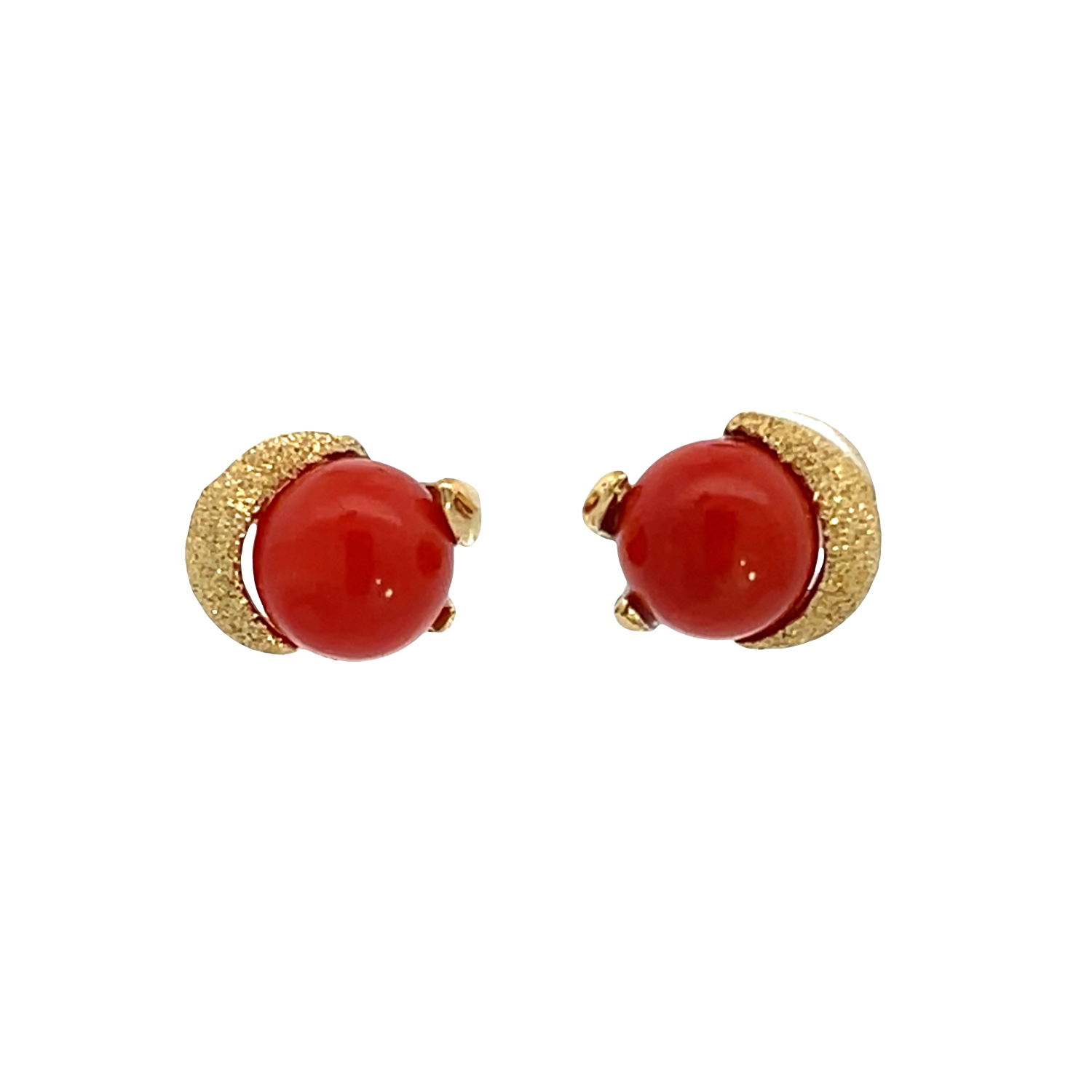 These estate 18K yellow gold stud earrings feature rich red coral beads set in decorative textured gold settings. The vibrant coral color creates beautiful contrast against the warm yellow gold while the ornate detailing adds vintage character to the design. These earrings are a bold pop of color that connects the wearer to the timeless beauty of the sea.Details