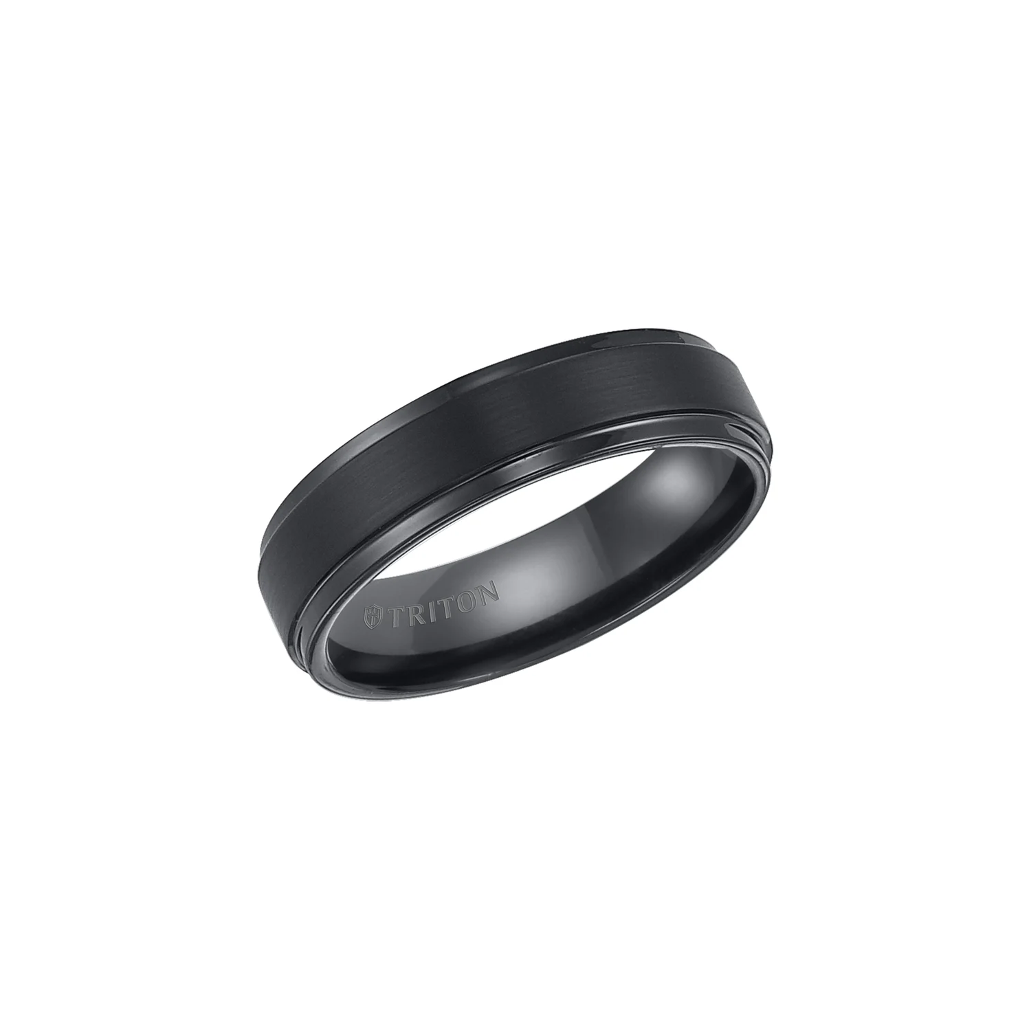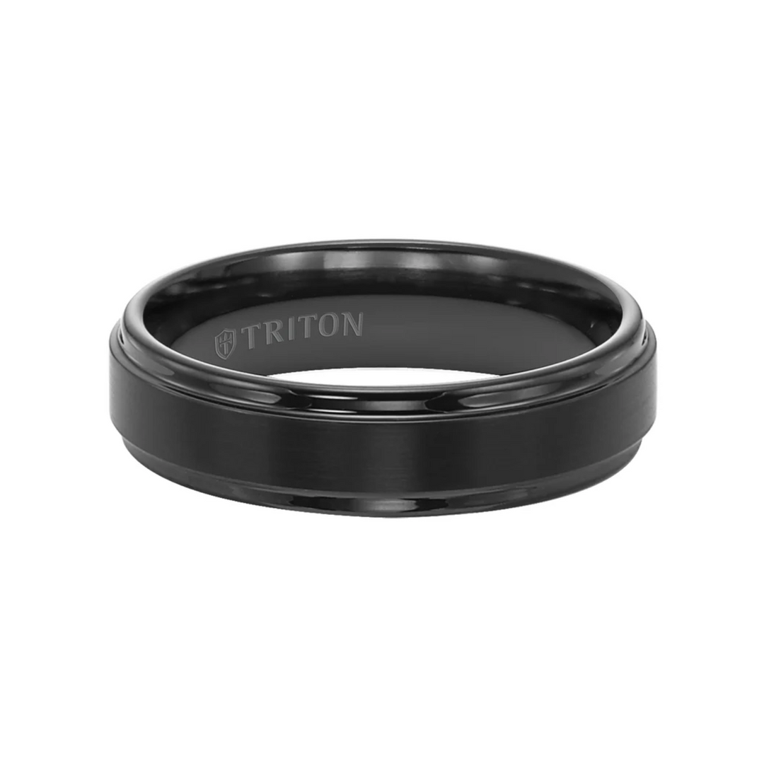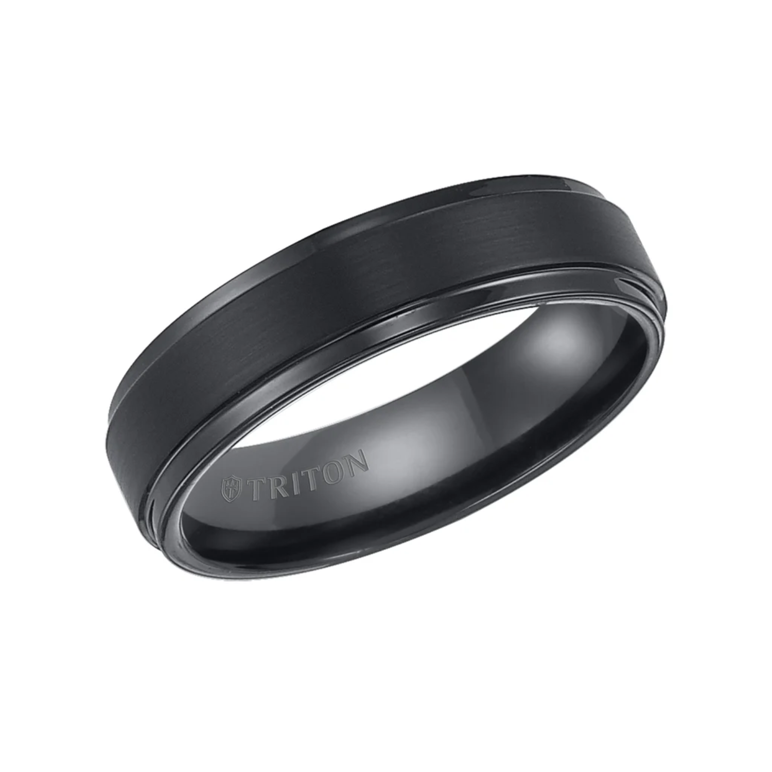 Elevate your style with this 6 mm step edge black tungsten wedding band. Classic yet contemporary, the band's distinctive step-edge design is heightened by the intriguing allure of black tungsten. The satin finish adds a refined touch, crafting a sleek silhouette that makes this wedding band a tasteful and enduring choice for the modern groom.Details