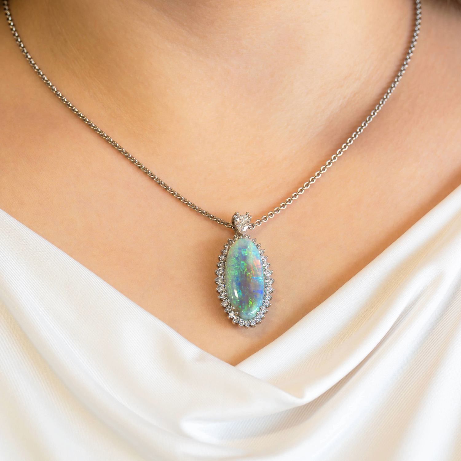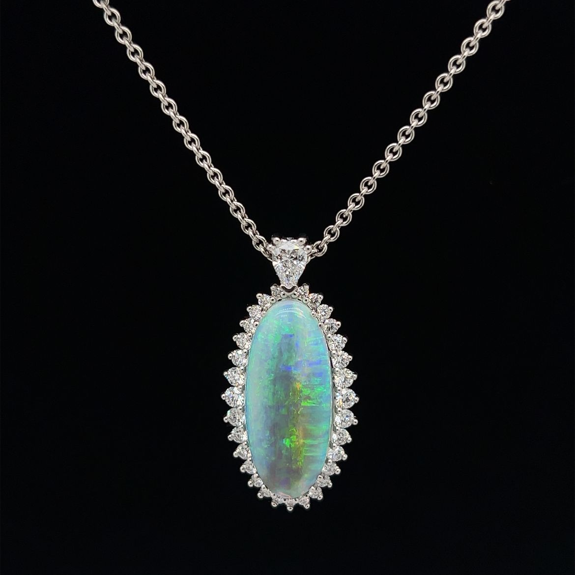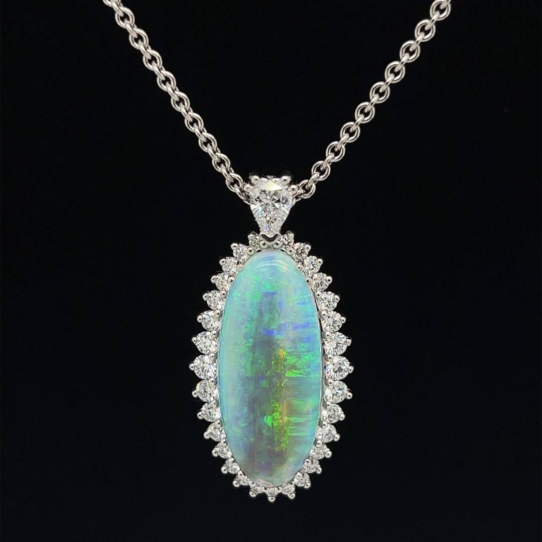 Elevate your elegance with our platinum Bensel Made pendant, featuring an exquisite oval cabochon cut Australian black and crystal base opal. This stunning opal is surrounded by a halo of sparkling diamonds, enhancing its vibrant play of color. Crafted in luxurious platinum, this pendant combines timeless beauty with modern sophistication. Perfect for special occasions or as a statement piece, this opal and diamond pendant is a magnificent addition to any jewelry collection.Details
