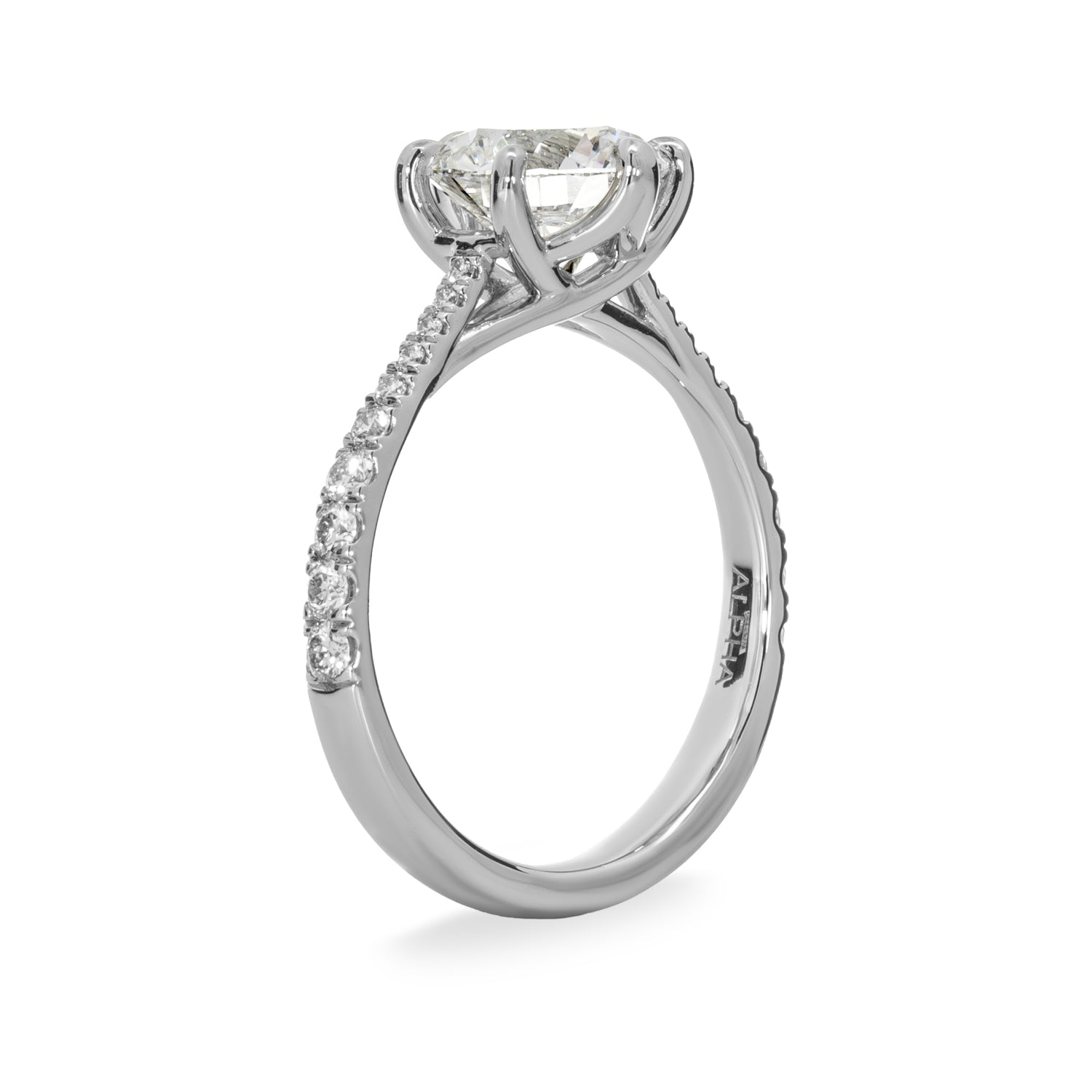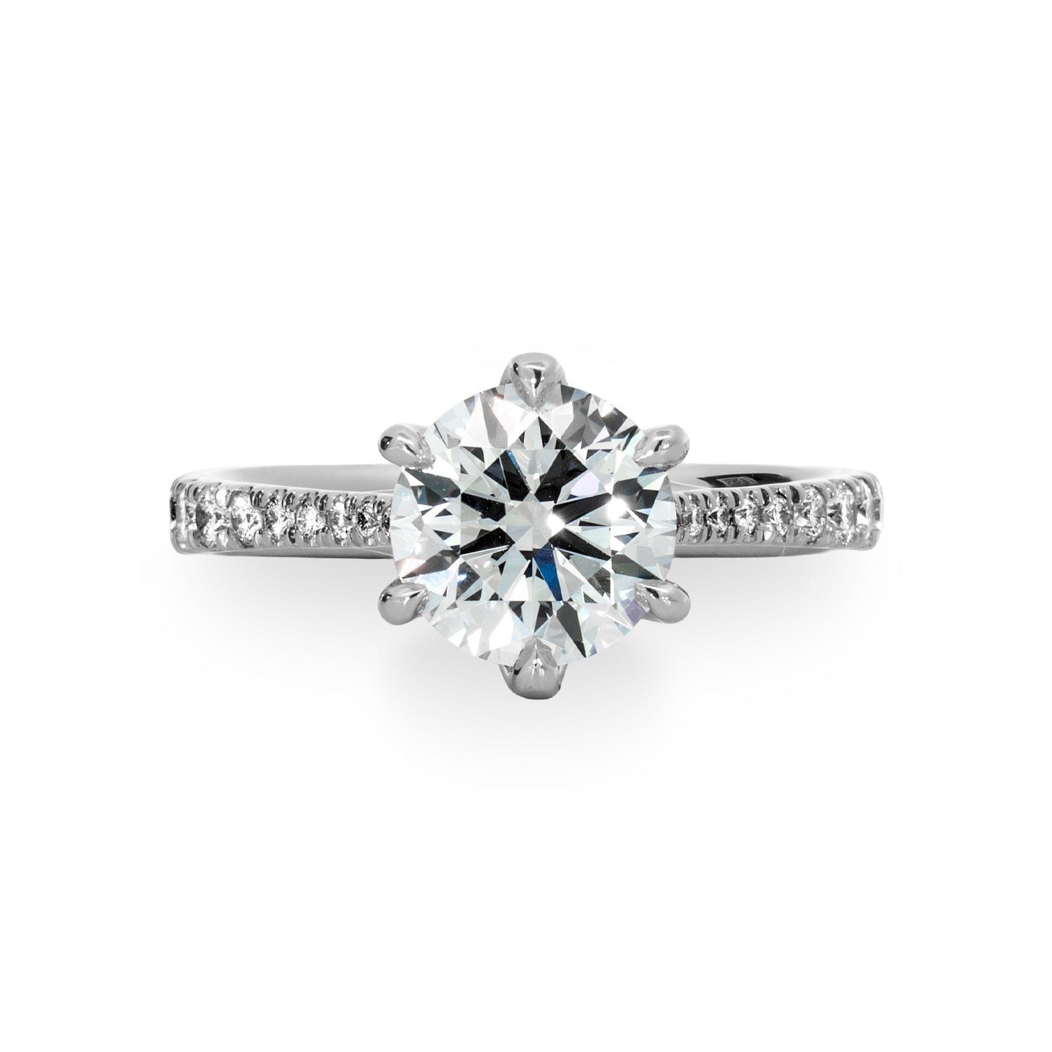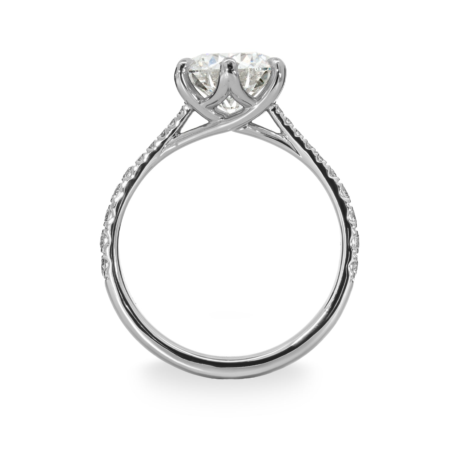 This platinum engagement ring showcases a striking round brilliant cut lab grown diamond set securely in a six-prong setting. The shank is accented with additional round brilliant cut lab grown diamonds, adding brilliance and refinement to the design. This ring is a timeless and elegant choice to mark a meaningful moment.Details