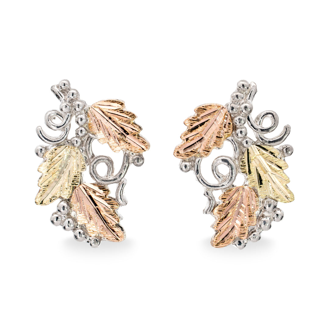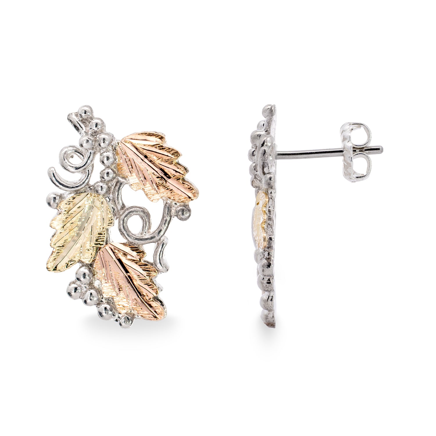 These estate earrings feature an intricate design crafted in sterling silver. They are highlighted with 10K Black Hills Gold leaves in rose and yellow tones, creating a classic style that reflects the artistry of Black Hills Gold.Details