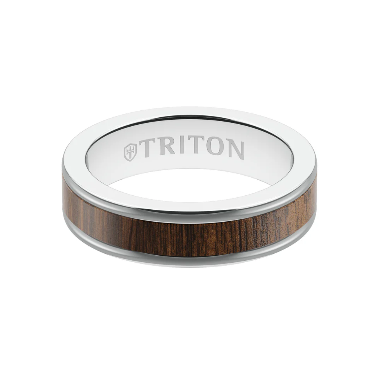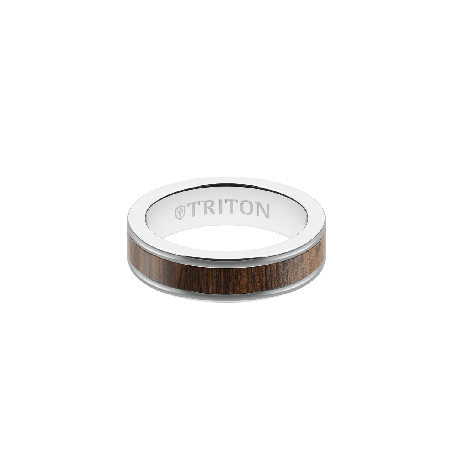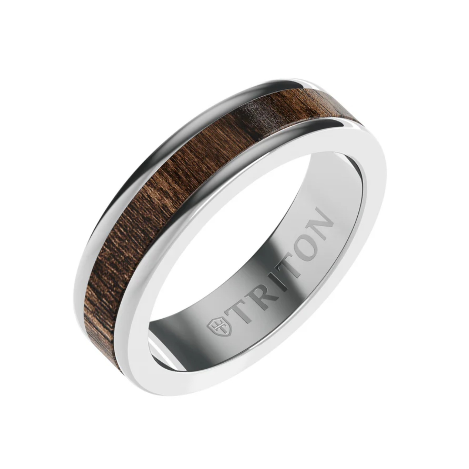 Showcase your unique style with this 6 mm contemporary wedding band. The band is meticulously crafted from durable white tungsten, known for its superior strength and scratch resistance. Adding to its aesthetic appeal is a beautifully contrasted wood inlay that runs around the circumference of the band. This distinctive feature lends an earthy touch to the otherwise sleek and modern design, creating a perfect balance between natural warmth and contemporary elegance. Ideal for anyone seeking a ring that marries modern sophistication with a rustic, outdoorsy vibe, this white tungsten wedding band with wood inlay makes a stylish and enduring statement.Details